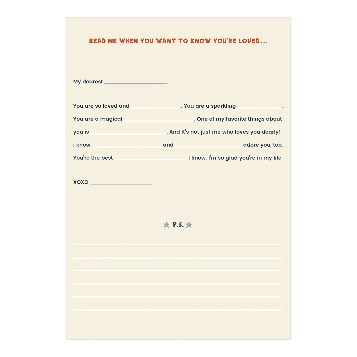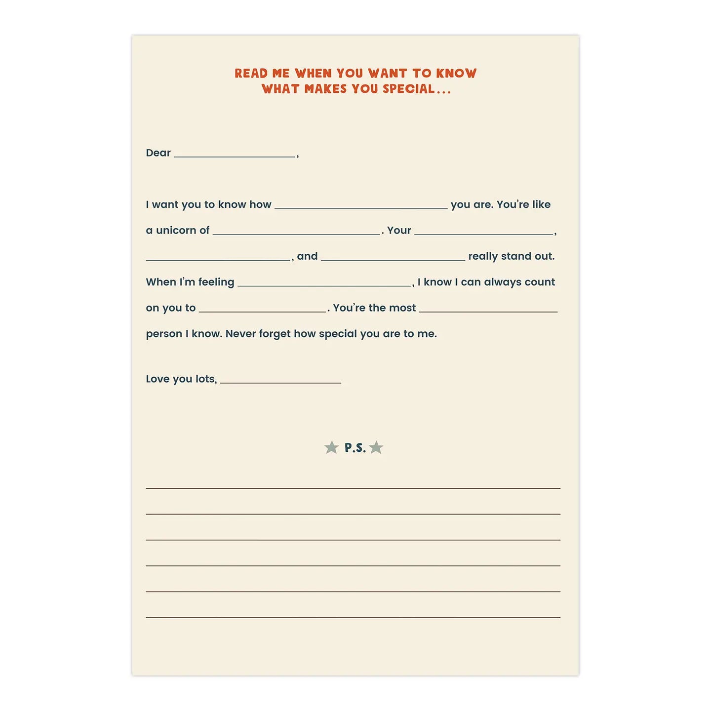 Letters Include: You Want to Know You’re Loved, It’s Your Birthday, You Need a Pep Talk, You Want to Know What Makes You Special You’re Feeling Nostalgic, You Need to Be Reminded You’re Beautiful, You’re Hurting, You Want to Know a Secret