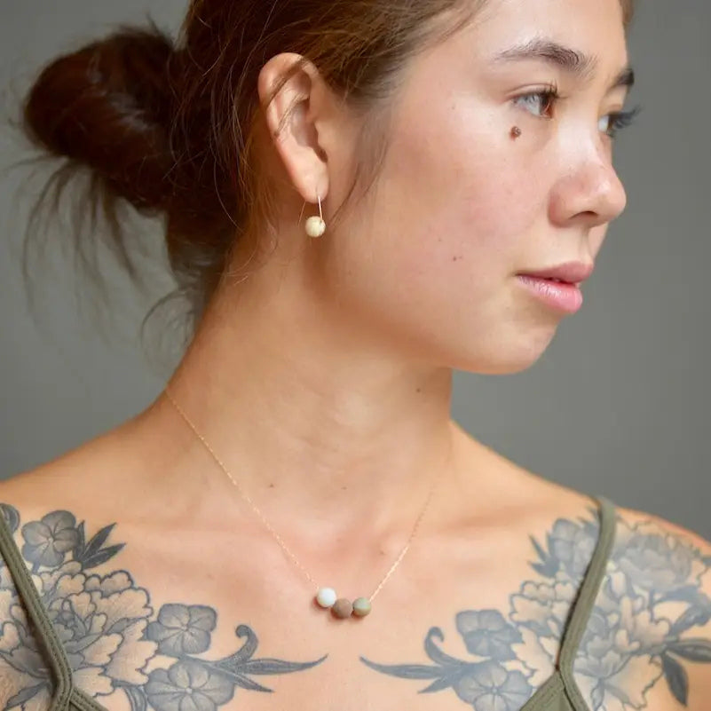 Matte Amazonite beads are suspended on elegant 14k gold fill chain. So simple and calming, suddenly everything seems clear. Part of our Becoming Collection, which explores the process and experience of evolving as a person throughout life. Choose from three different styles.