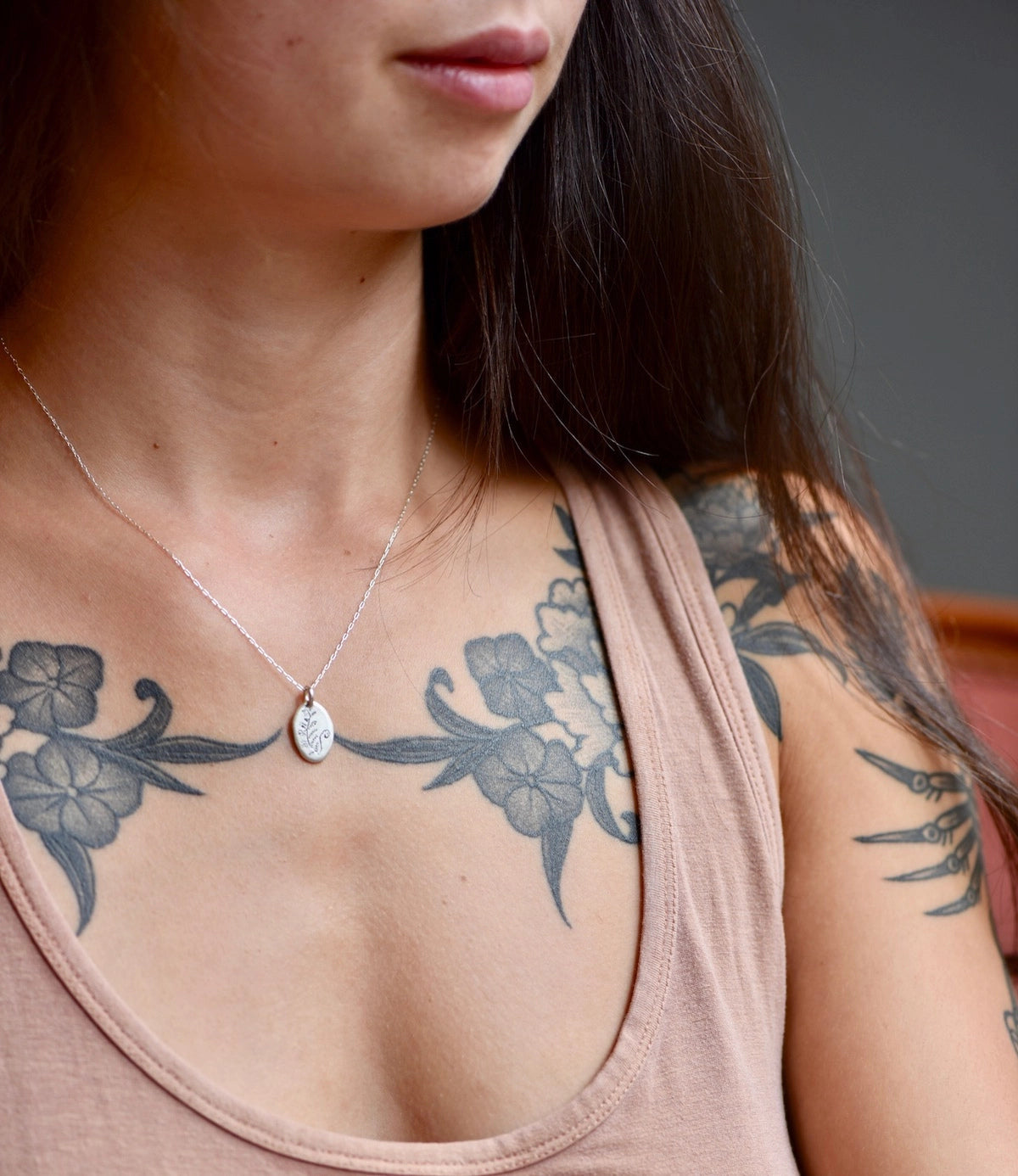 Sterling silver pendant on sterling chain, 18″ total length.