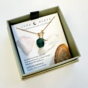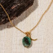 The Emerald Celestial Being Necklace features a radiant green gemstone set in a gold celestial pendant. Symbolizing wisdom, protection, and harmony, this piece blends spiritual meaning with timeless elegance. Wear it layered or solo as a striking everyday accessory.