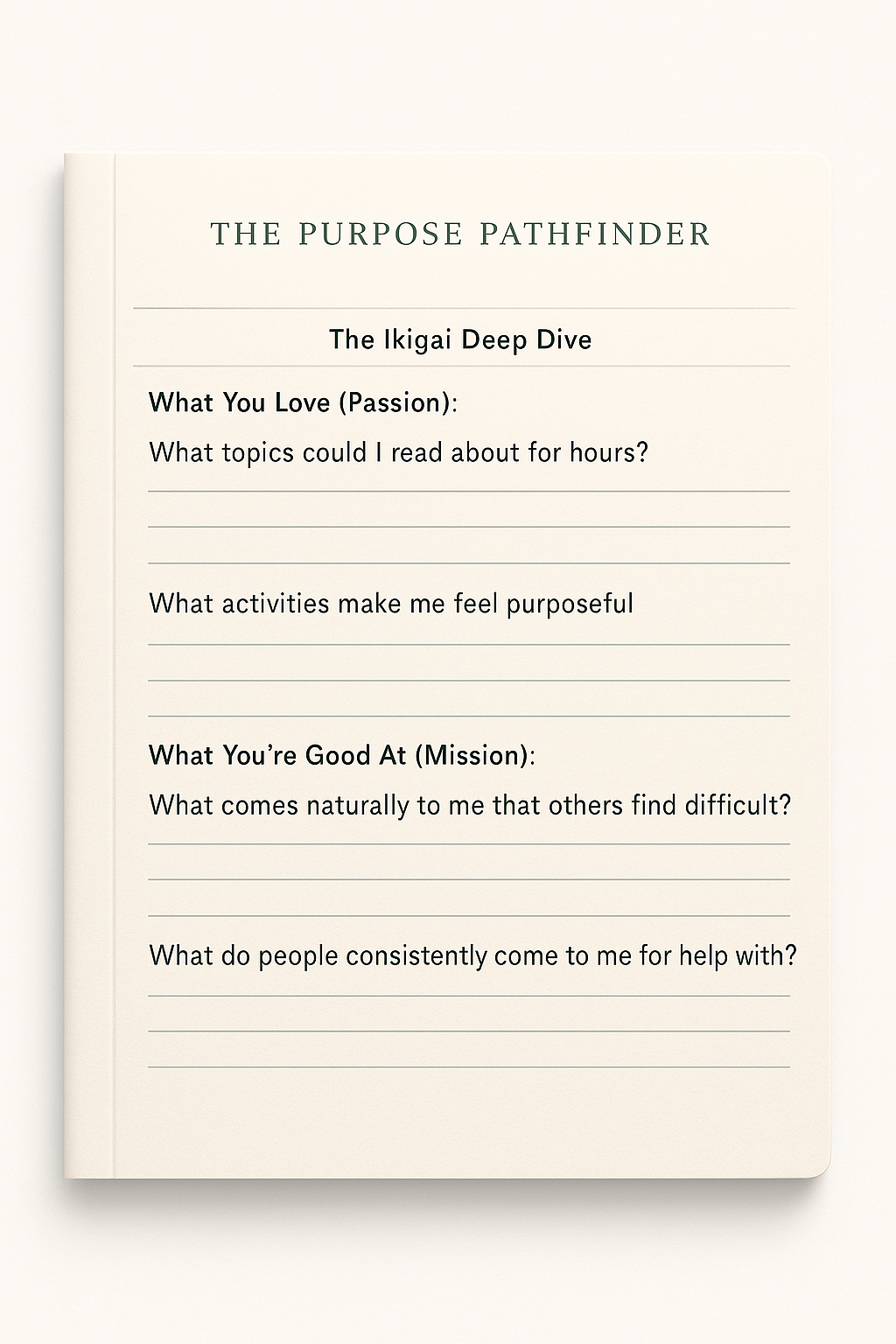 Printable purpose/Ikigai journal to clarify values and strengths, design small experiments, and align work and life. Instant PDF download.