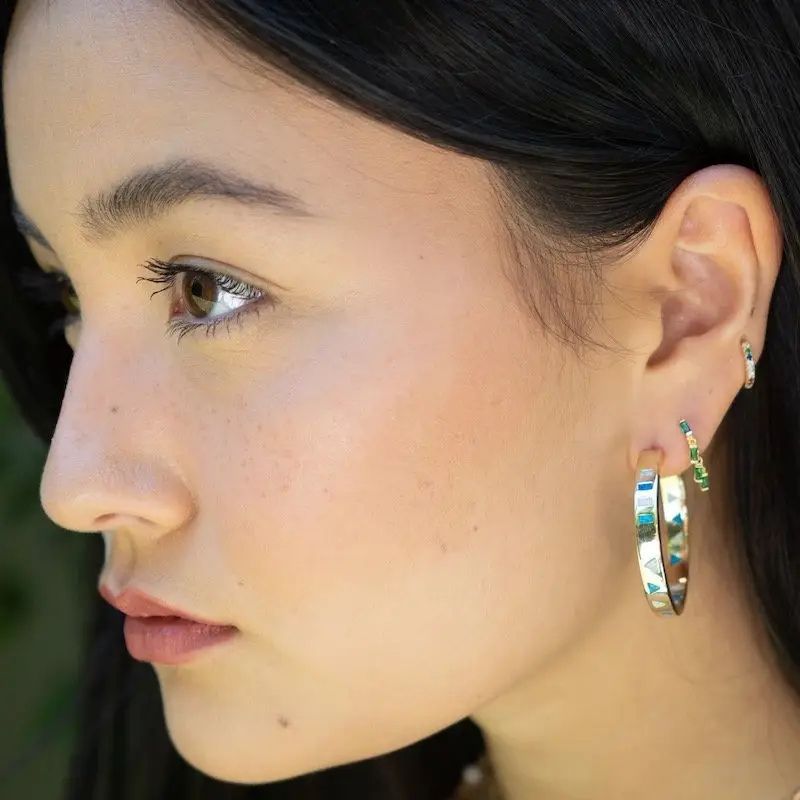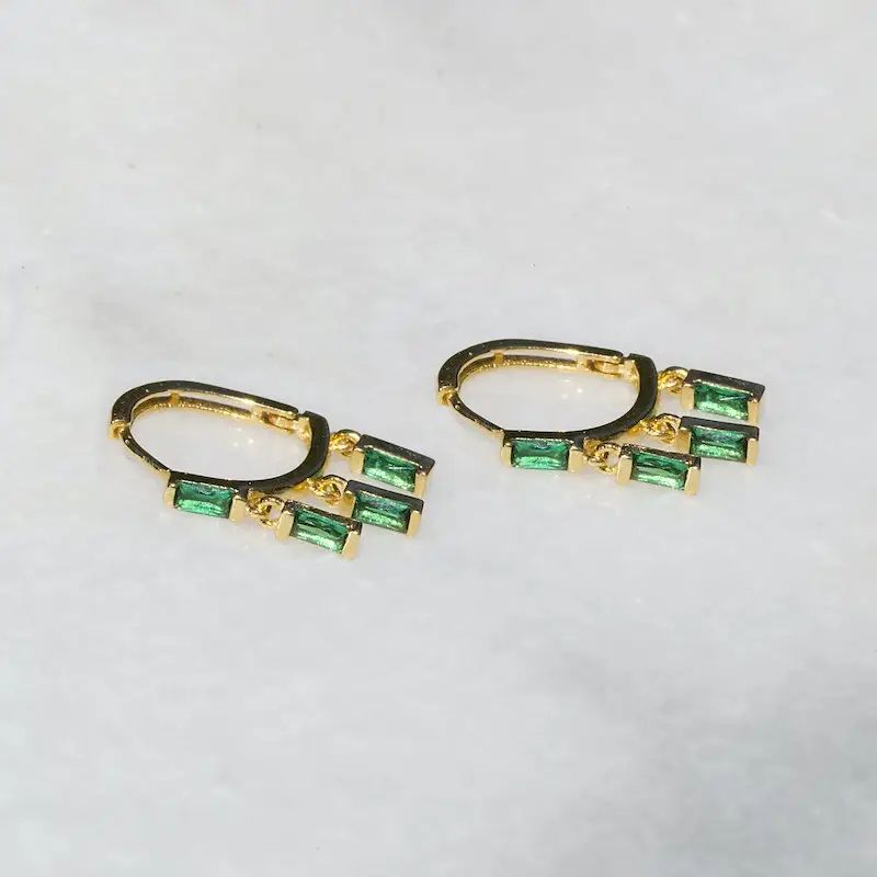 Our tiniest huggies made of 14K vermeil cz with 4 dangling tiny green onyx gemstones. So cute an everyday earring or as a addition to your ear game. Shown worn layered with the Talisman Hoops + Candy Gem necklace.