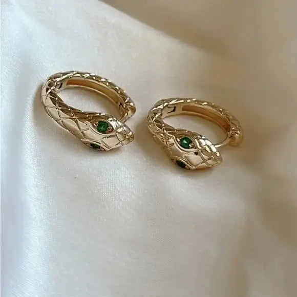 Beautiful dainty serpent huggies featuring emerald green CZ stones