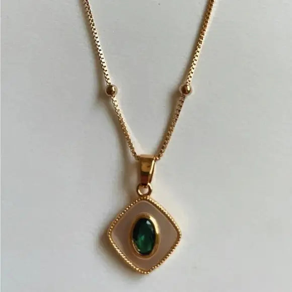 14K Gold filled ball chain featuring mother of pearl and green emerald CZ stone pendent