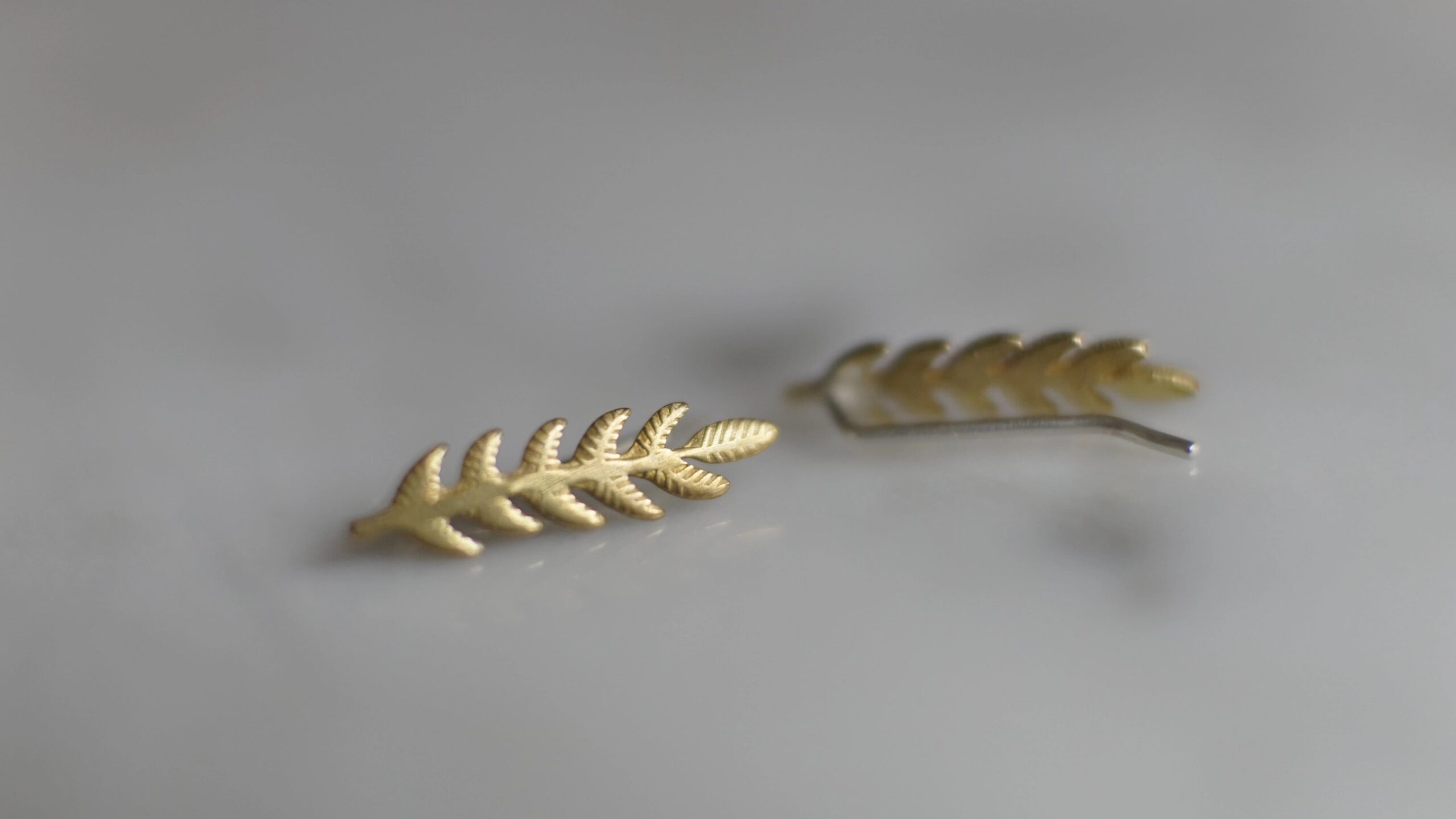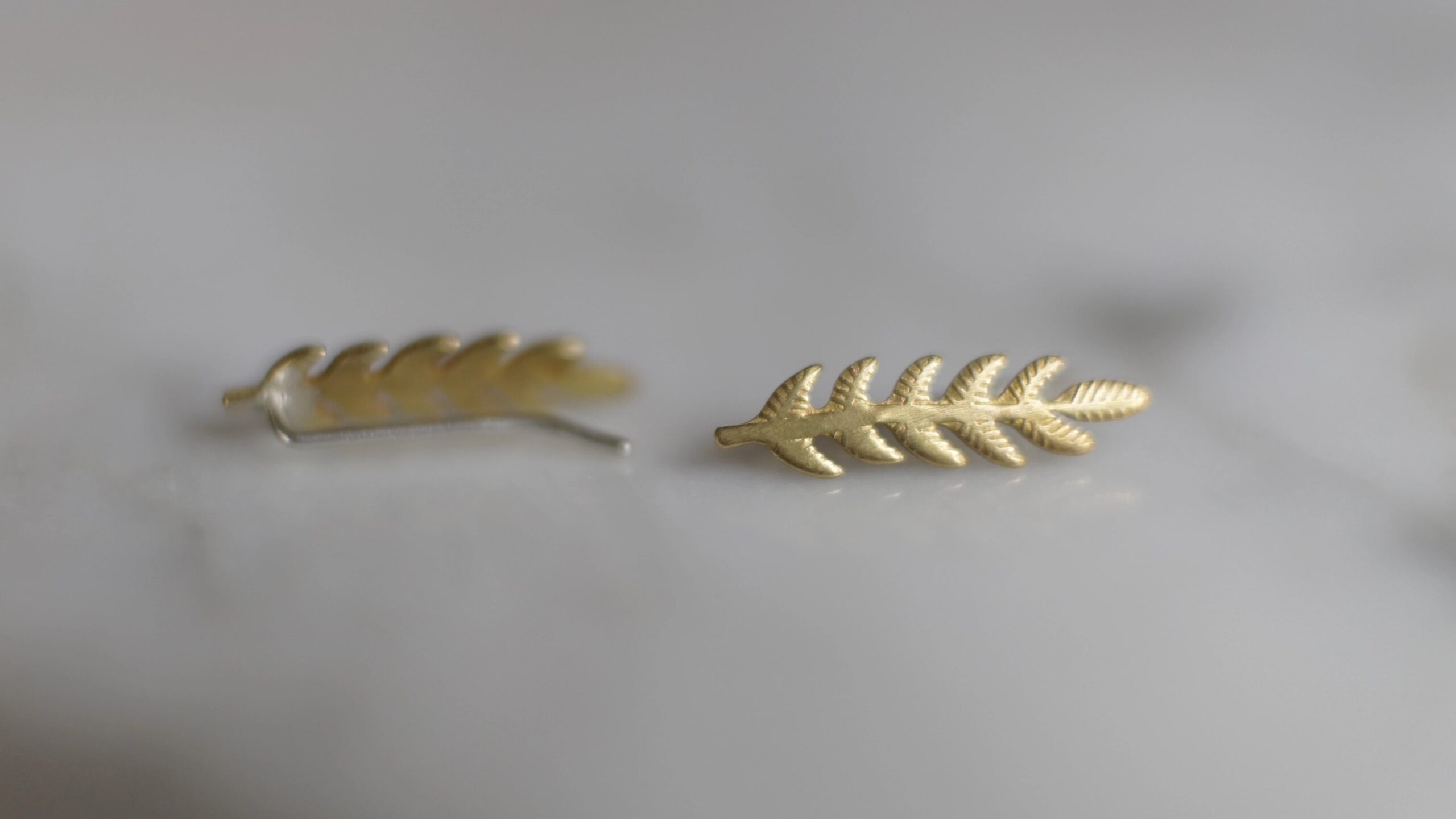 Bring a touch of nature into your wardrobe with these stunning brass leaf ear climbers. Crafted with solid brass and high quality .940 silver posts, these climbers feature an intricate leaf design that gracefully curves along your ear.