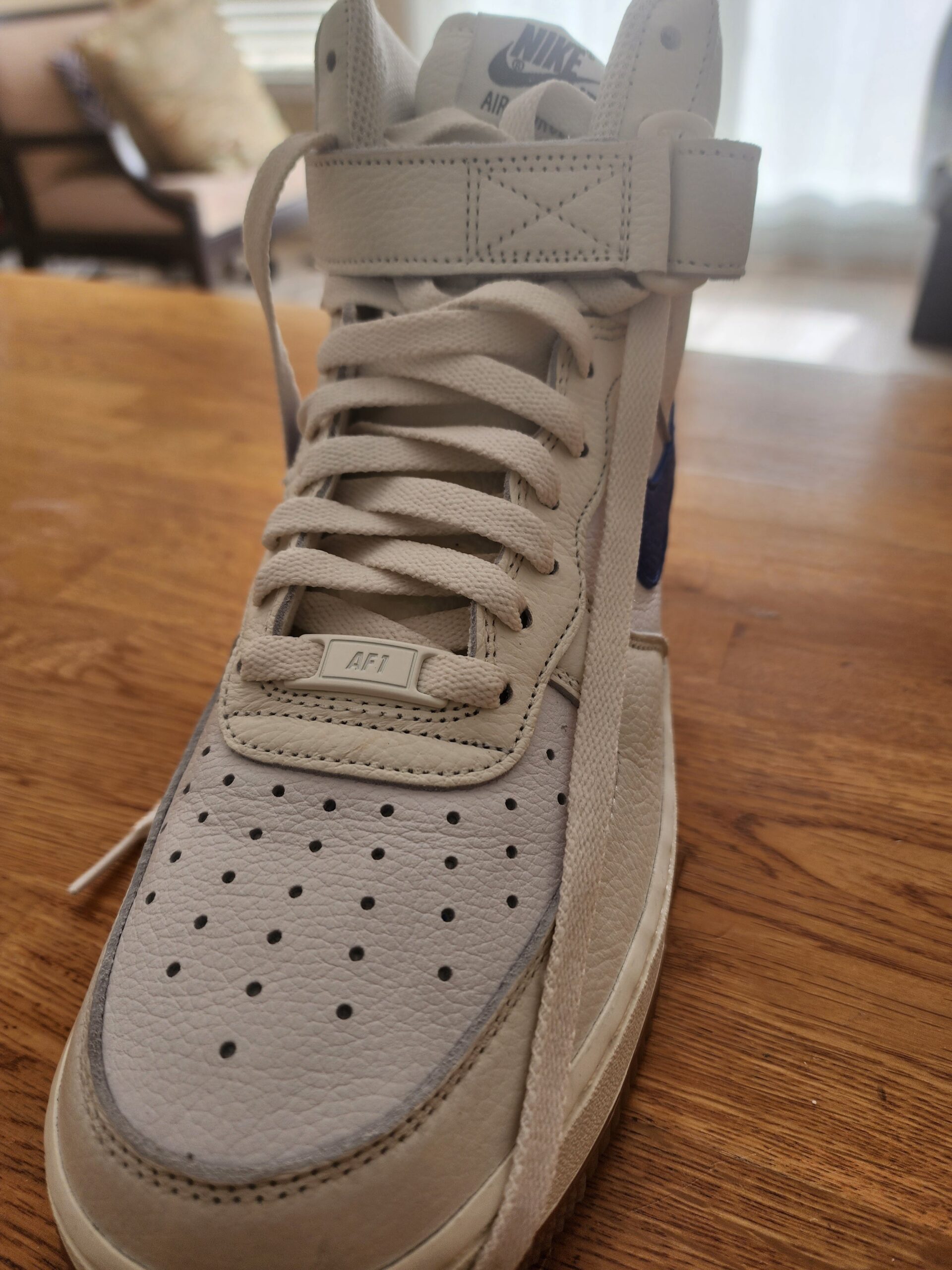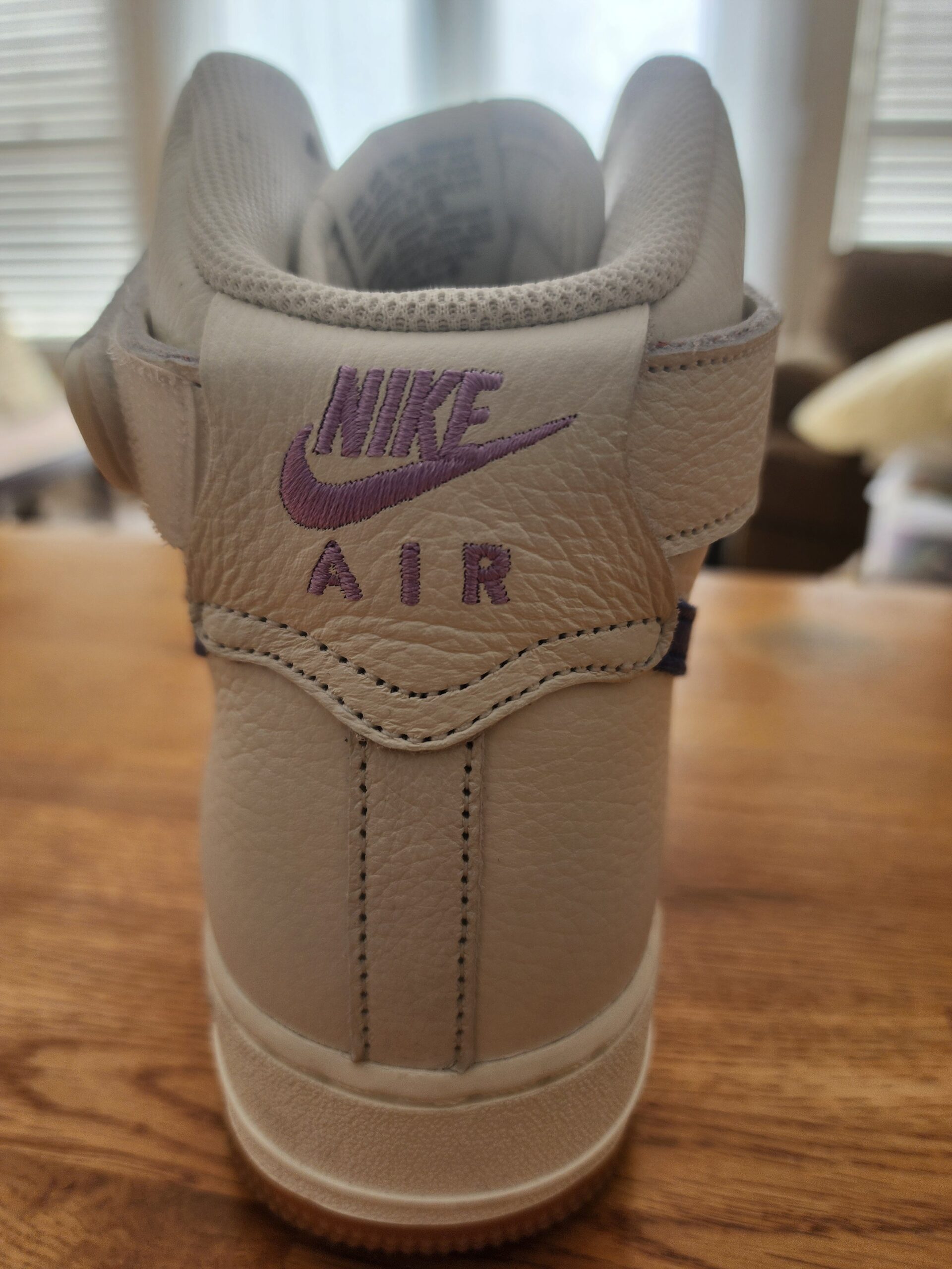 Custom Nike Hi Tops With Royal Blue Stripe and Lavender Stitching.
